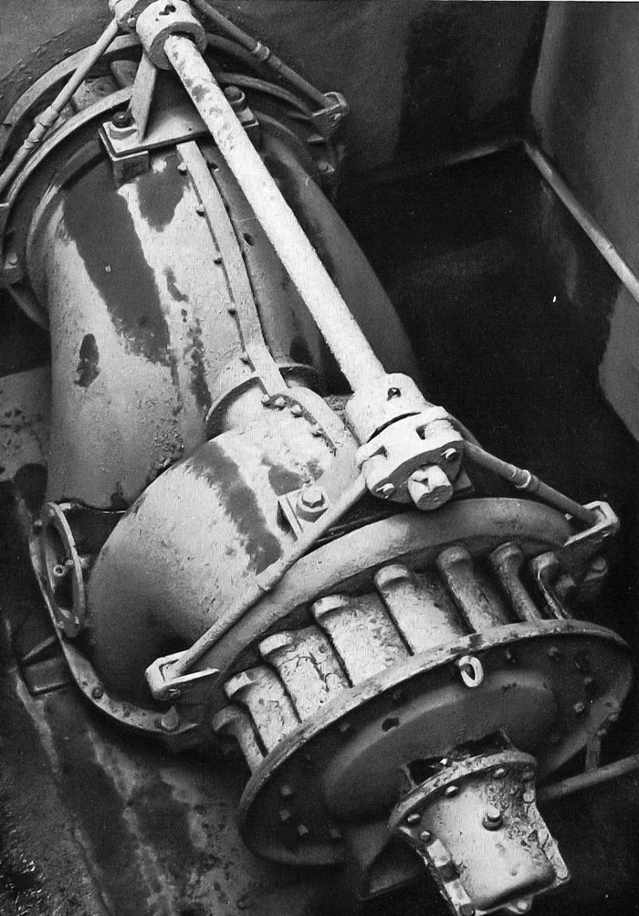 Doppel-Francisturbine von Maschinensatz 1. Die Welle oben ist mit der Regelstange im Maschinenhaus verbunden um den Wasserzufluss über die kranzförmig angeordneten Leitschaufeln in die Turbinen zu verändern. |