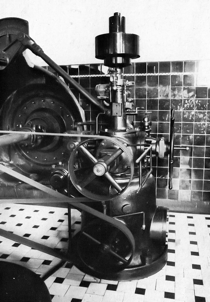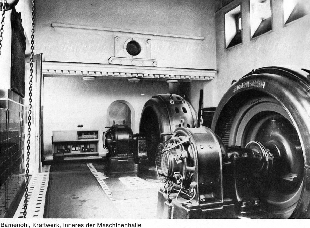 Die Bilder stammen aus dem Buch "Technische Denkmäler in der Bundesrepublik Deutschland" Band 2 von Dr. Rainer Slotta. Aufnahmen wahrscheinlich Anfang der 1970er Jahre. Hier ein lesenswerter Auszug der Beschreibung des Kraftwerks Bamenohl aus dem Jahr 1977 von dem bedeutenden Industriearchäologen Prof. Dr. Rainer Slotta: "Das Innere des Kraftwerks wird von den schwarzen Maschinen der Generatoren beherrscht. Der Maschinenraum ist länglich rechteckig, mit hellen Bodenfliesen und schwarzen quadratischen Einschlüssen belegt, bis in Mannshöhe mit braunen Wandfliesen gekachelt, darüber hell verputzt. Die Fenster erhellen den Raum genügend. Die Ostseite eröffnet sich bühnenartig zum Turmuntergeschoß, in welchem das Reglerpult des Maschinisten steht: Ein mächtiges, etwas aufgedunsenes Gesims mit Klotzkonsolen dient als Abschlußgesims der "Bühne" und trug innerhalb einer Kartusche eine runde Uhr, die heute verschwunden ist. Auf der Unterstromseite seitlich der Eingangstür hat sich eine besonders schöne Bleikartusche erhalten, deren Inschrift in Majuskeln die Erinnerung an den Kraftwerksbau wachhält. Auf dem Rücksprung der Längsmauern des Maschinenraumes liegen die Gleise für den Laufkran". Das Buch ist mit etwas Glück nur noch antiquarisch zu bekommen. Hierin werden auch die Nachbarkraftwerke in Lenhausen Inbetriebnahme 1928 und Ahausen Inbetriebnahme 1938 ausführlich beschrieben. |