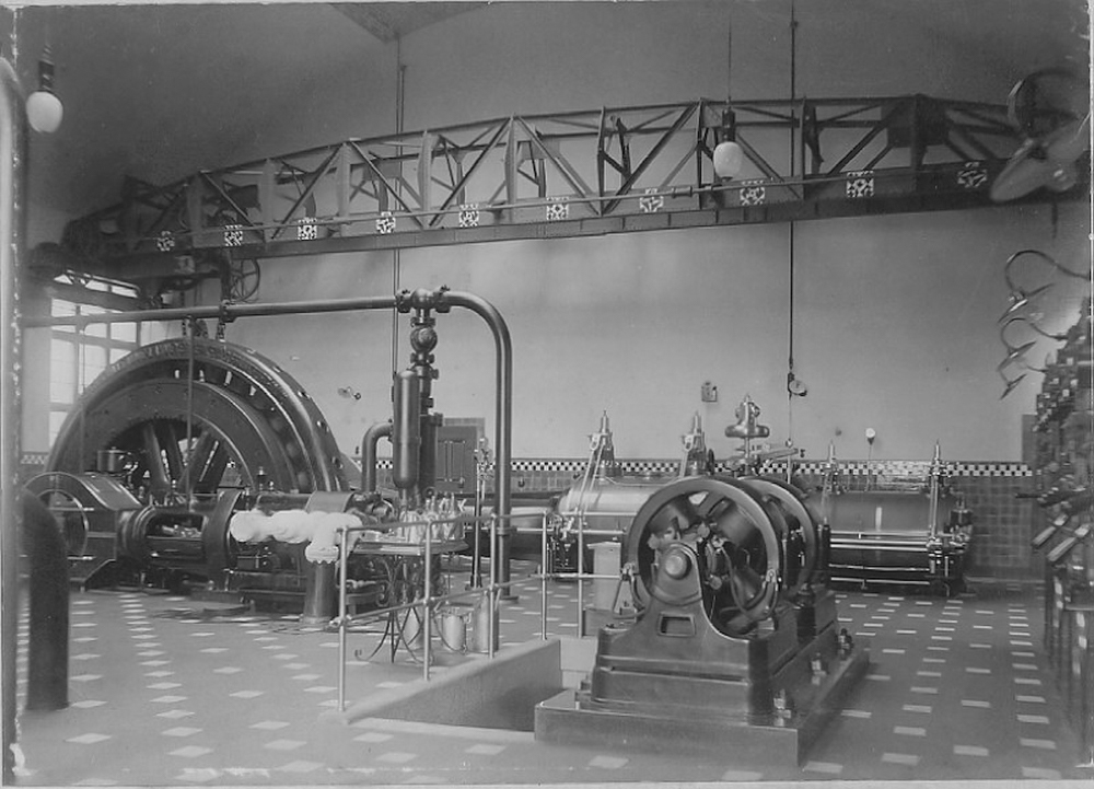 Zurück Auf diesem historischen Bild ist links vor dem Gleichstrom-Schwungradgenerator (Garbe-Lahmeyer 200 kW) die Kältemaschine zu erkennen.(Eisansatz) Rechts hinten befinden sich Nieder- und Hochdruckzylinder der Tandem-Dampfmaschine von MAN.(Baujahr 1906 und 1981 verschrottet) Normaleistung 400 PS, Max 530 PS (Quelle: Albert Gieseler) Im Vordergrund steht der heute noch erhaltene Umformersatz. Bemerkenswert ist auch der Tisch neben der Treppe, auf dem die Ölkannen abgestellt wurden. Bild: Archiv Brauerei Riegel In der Maschinenhalle sind heute neben dem Umformer noch der Portalkran, sowie Boden- und Wandfliesen erhalten. (siehe unten) Die ganz rechts erkennbare Schalttafel ist einer modernen Prozeß-Leitwarte gewichen. |