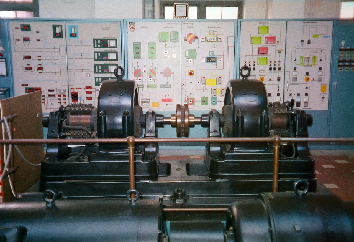 Über 100 Jahre "Technikgeschichte" auf einen Blick. Ein alter Umformersatz vor der modernen Schaltwarte der Brauerei. (Zustand 1997) |