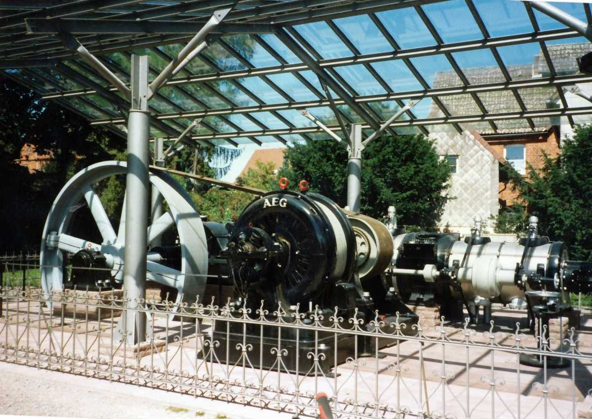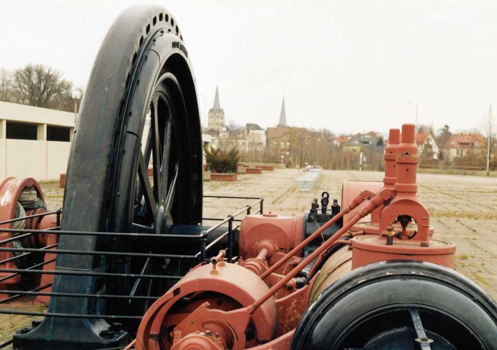 dem Gelände des Wilhelm Normann Berufskollegs in Herford. Drehzahl 125 U/min Die Maschine befand sich früher in einer Möbelfabrik an der Engerstraße, neben der Herforder-Motorenfabrik. Generator von UNION-Elektr.-Gesellschaft. Berlin, Hersteller der Dampfmaschine unbekannt. Bilder aus den 1990er Jahren |
