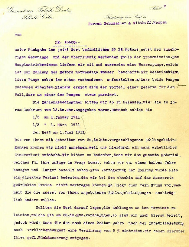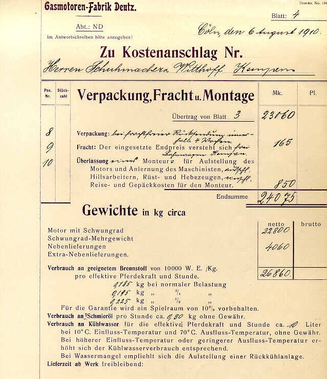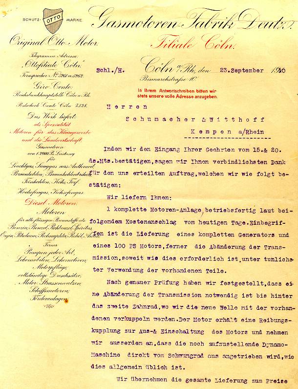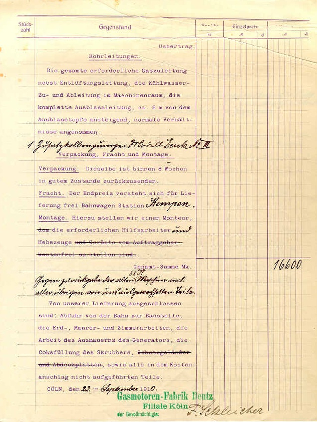 "Kostenanschlag" eines 100 PS DEUTZ Gasmotors vom 23. September 1910