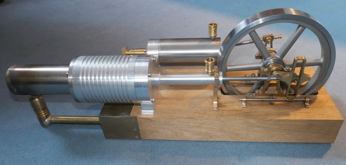 Oben: Video vom Modell in Zeitlupe Links: ein Stirlingmodell Typ Gamma, mit getrennten Zylindern für Verdränger- und Arbeitskolben. Schwungraddurchmesser 140 mm Materialbausatz der Firma Bengs |