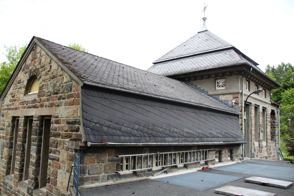 Zurück Im Tal der Lenne gibt es zahlreiche Wasserkraftwerke, in denen noch die originalen Turbinen und Generatoren seit gut 100 Jahren laufen. Rechts das denkmalgeschützte Gebäude des Wasserkraftwerks Bamenohl. |