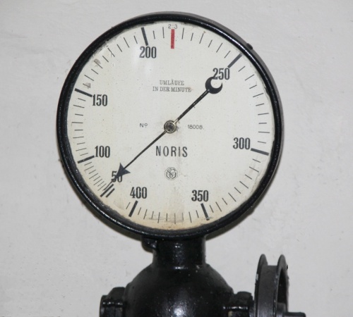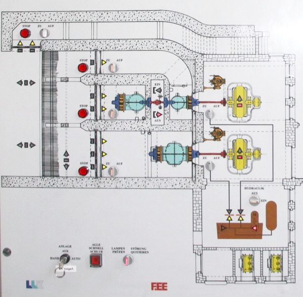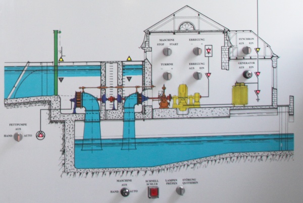 der blauen Mülltüte links mal abgesehen). Der Voith-Turbinenregler ist zwar nicht mehr in Betrieb, aber noch am Originalstandort vorhanden. Die moderne Hydraulik steht unauffällig in der Ecke. |