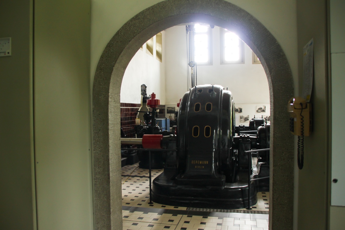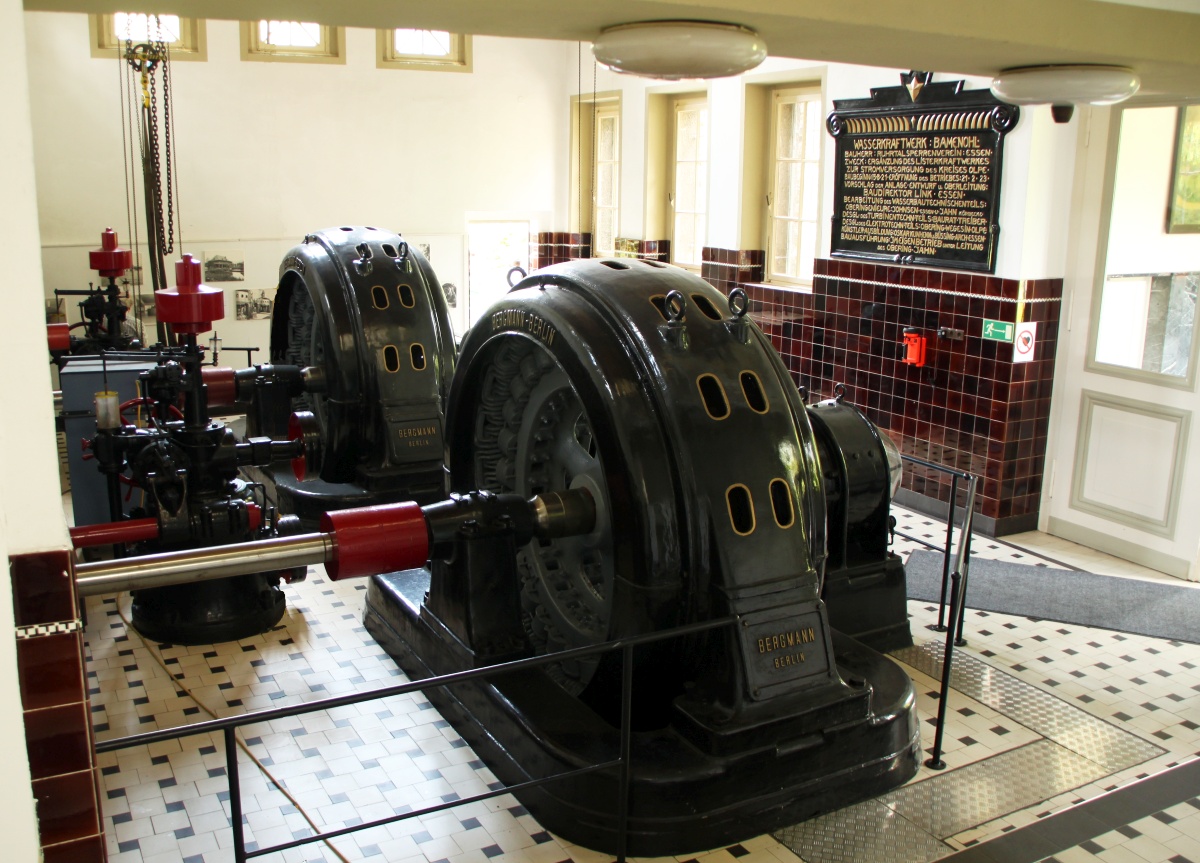 Blick auf einen der beiden Synchrongeneratoren der Firma Bergmann-Elektrizitätswerke-Berlin. | ![]() |