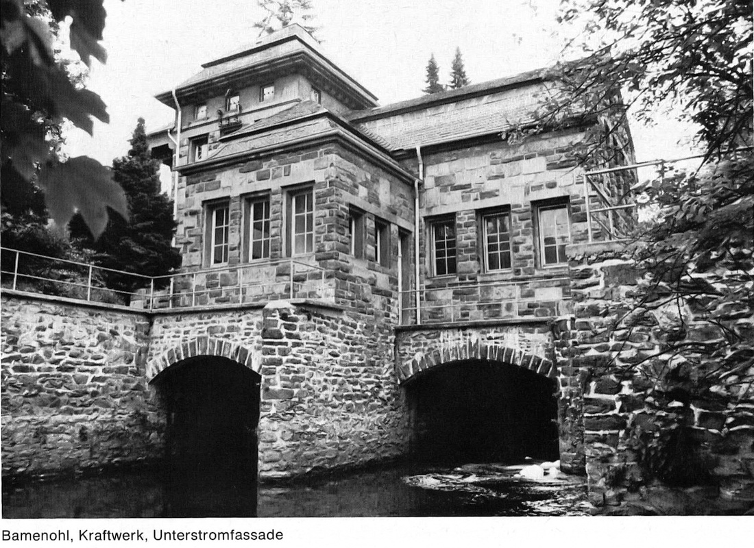 Die Bilder stammen aus dem Buch "Technische Denkmäler in der Bundesrepublik Deutschland" Band 2 von Dr. Rainer Slotta. Aufnahmen wahrscheinlich Anfang der 1970er Jahre. Hier ein lesenswerter Auszug der Beschreibung des Kraftwerks Bamenohl aus dem Jahr 1977 von dem bedeutenden Industriearchäologen Prof. Dr. Rainer Slotta: "Das Innere des Kraftwerks wird von den schwarzen Maschinen der Generatoren beherrscht. Der Maschinenraum ist länglich rechteckig, mit hellen Bodenfliesen und schwarzen quadratischen Einschlüssen belegt, bis in Mannshöhe mit braunen Wandfliesen gekachelt, darüber hell verputzt. Die Fenster erhellen den Raum genügend. Die Ostseite eröffnet sich bühnenartig zum Turmuntergeschoß, in welchem das Reglerpult des Maschinisten steht: Ein mächtiges, etwas aufgedunsenes Gesims mit Klotzkonsolen dient als Abschlußgesims der "Bühne" und trug innerhalb einer Kartusche eine runde Uhr, die heute verschwunden ist. Auf der Unterstromseite seitlich der Eingangstür hat sich eine besonders schöne Bleikartusche erhalten, deren Inschrift in Majuskeln die Erinnerung an den Kraftwerksbau wachhält. Auf dem Rücksprung der Längsmauern des Maschinenraumes liegen die Gleise für den Laufkran". Das Buch ist mit etwas Glück nur noch antiquarisch zu bekommen. Hierin werden auch die Nachbarkraftwerke in Lenhausen Inbetriebnahme 1928 und Ahausen Inbetriebnahme 1938 ausführlich beschrieben. |