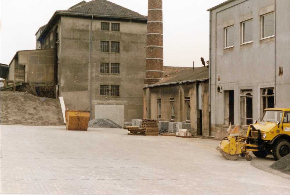 der Umbauarbeiten Ende der 1980er Jahre. In dem Gebäude hinter dem gelben Unimog stand die Dampfmaschine. Links daneben war das Kesselhaus. Im Container liegt die Schalttafel.  |
