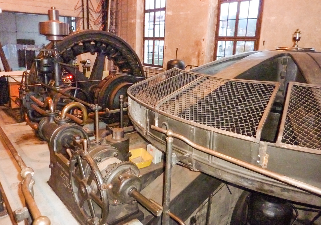 erhalten, aber nicht mehr betriebsfähig (Schwungradgenerator Baujahr ca. 1898 mit