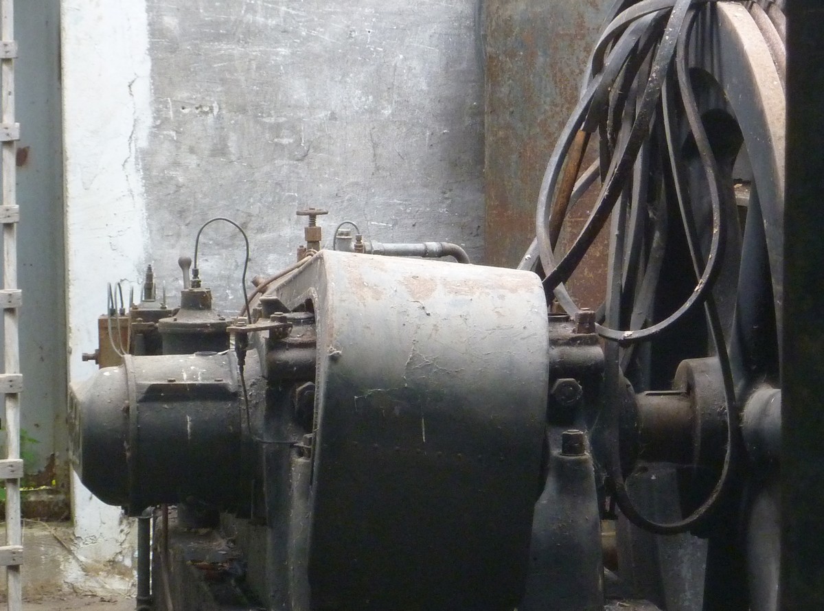 Keilriemen in dem mächtigen Schwungrad. Normalerweise werden bei diesen Motoren Flachriemen zum Antrieb benutzt. Rechts an der Wand hängt der Kraftstofftank (Tagestank), hinter dem Schwungrad steht der Druckluftbehälter zum Anlassen des Motors. Dieser Behälter kann, nachdem der Motor angesprungen ist, wieder mit den Abgasen - bevor das Auslassventil öffnet - unter Druck gesetzt werden für den nächsten Start. Unten rechts ist ein Teil eines Kompressors zu sehen. In dem Bergwerk wurde auch improvisiert, die Halterung des Tagestanks rechts besteht aus 2 ausrangierten Bohrern. |