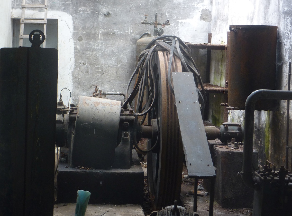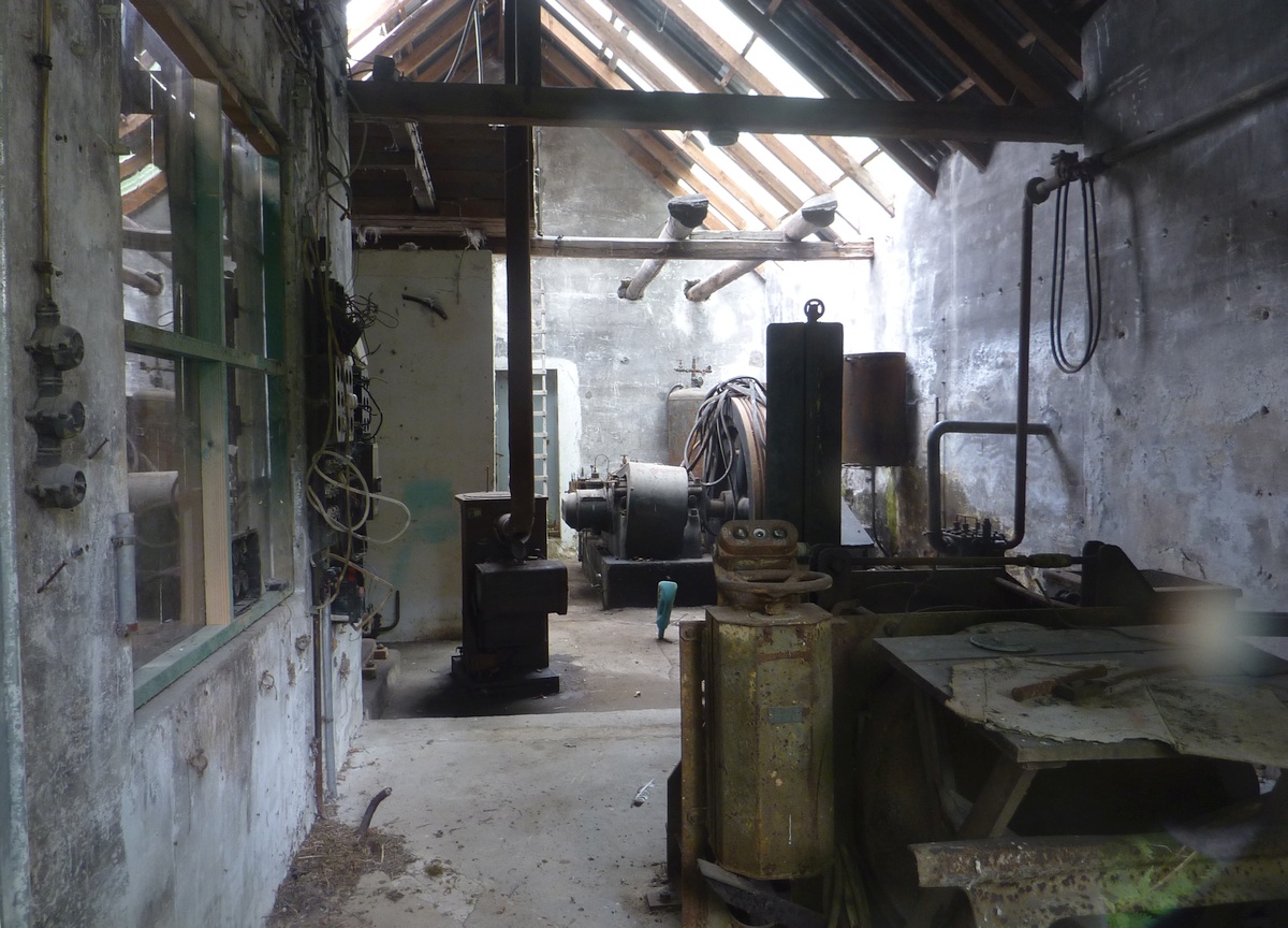 ein Blick durch das Fenster reichen. Im Hintergrund ist ein älterer 1 Zylinder-Dieselmotor der Herforder Motorenwerke Typ BS (40 PS bei 400 U/min) oder CSN (50 PS bei 380 U/min) zu sehen, der als Antriebsmaschine diente. Im Vordergrund ein AEG Anlasser, wahrscheinlich für den Haspel rechts daneben Links unten hinter der zurückspringenden Wand - neben dem Ölofen - ist ein Fundament mit Verschraubungen einer unbekannten Maschine zu sehen. Zum Glück wurden auf dem Dach durchsichtige Platten verlegt, die im Innenraum für gute Lichtverhältnisse sorgen. |
