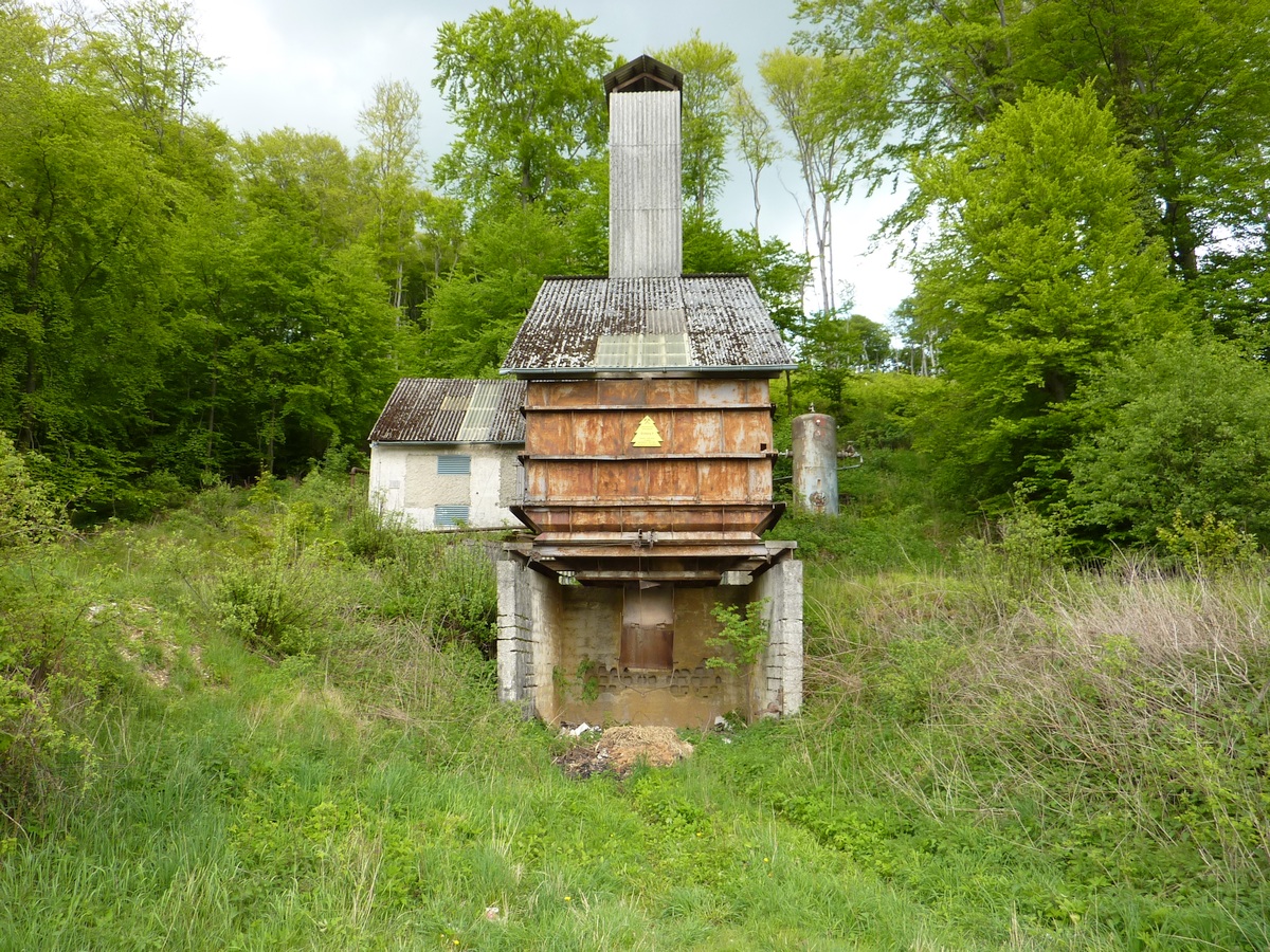 ist. Da diese Anlage weit ab von einer Stromversorgung lag, musste die benötigte Energie vor Ort erzeugt werden. In dem Betriebsgebäude links befinden sich ein Dieselmotor, ein Haspel zur Materialförderung, ein Kompressor für die Abbauwerkzeuge und wahrscheinlich mal ein Generator für die Beleuchtung unter Tage. |