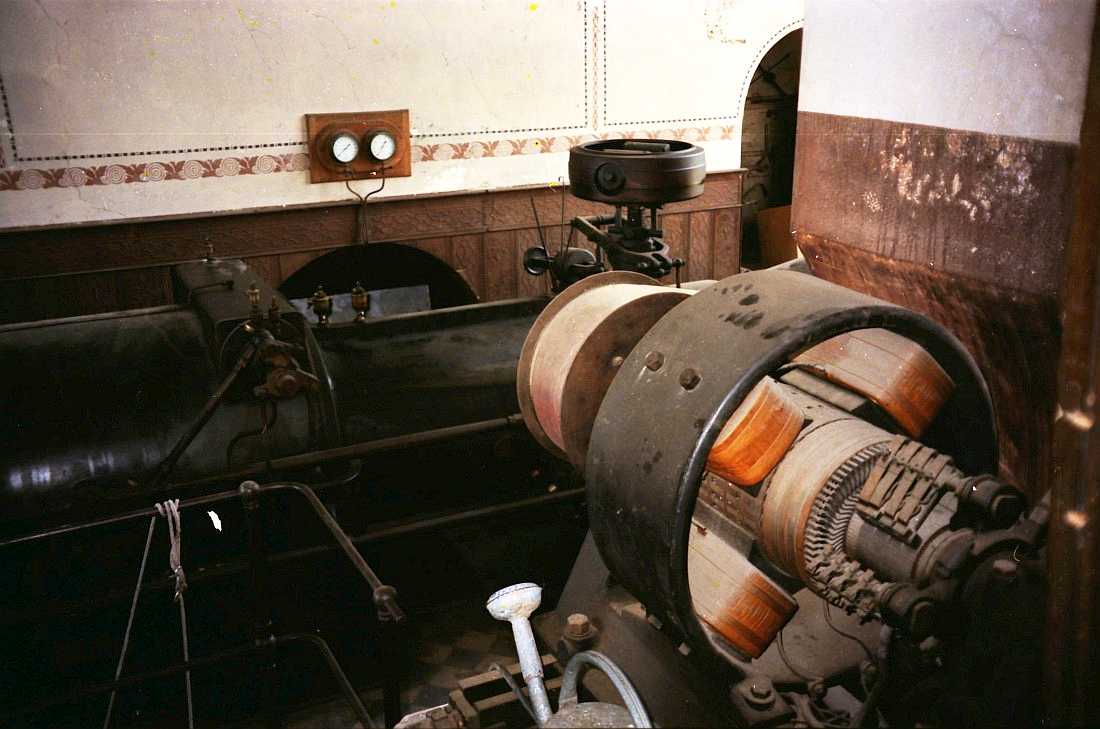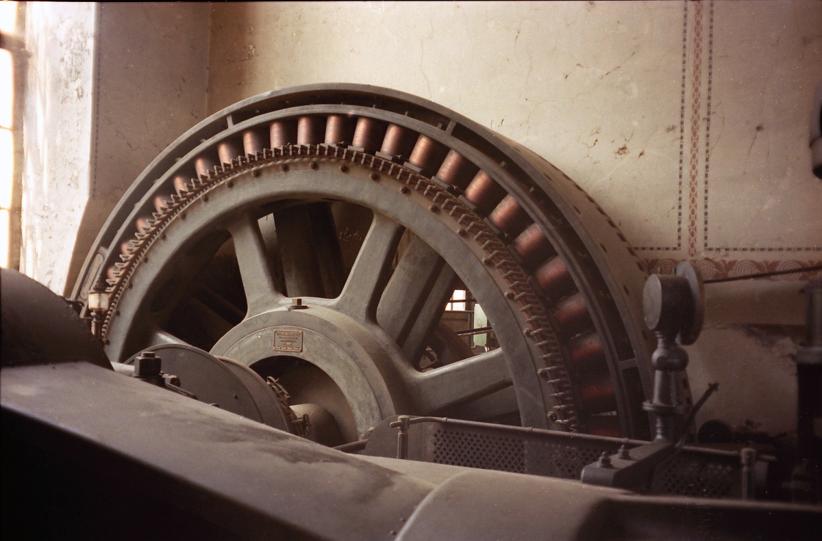 BBC Drehstromgenerator Zwischen den Speichen rechts ist der Raum zum Wasserkraftwerk erkennbar. Blick von der anderen Seite Zurück |