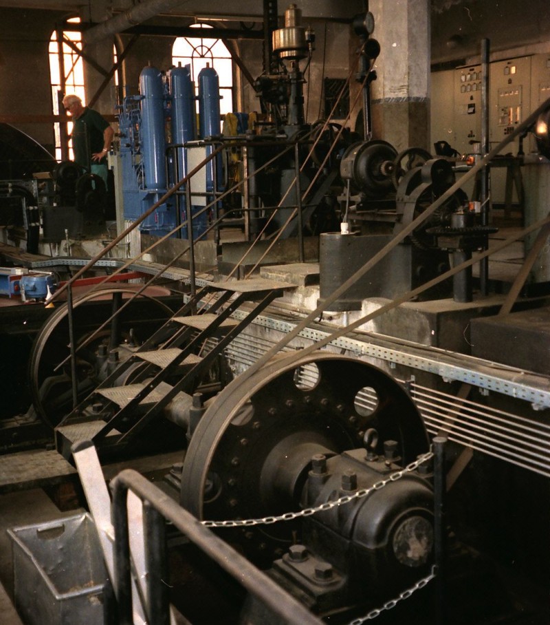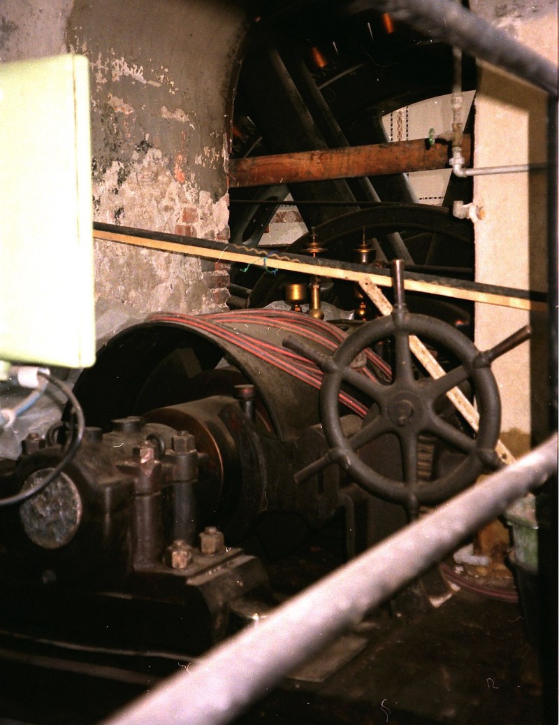 Blick vom Wasserkraftwerk zur Dampfmaschine, unten links ist die durchtrennte Welle erkennbar.
