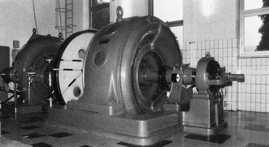 sehen. Links der Voith-Turbinenregler mit der Regelstange, die von oben durch eine Hohlwelle die Schaufeln der vertikalen Kaplan-Turbine verstellt. Der alte Generator mit Regelung ist komplett verschwunden und die Turbine wurde im Untergeschoss mit einem Getriebe und neuen Generator versehen. |